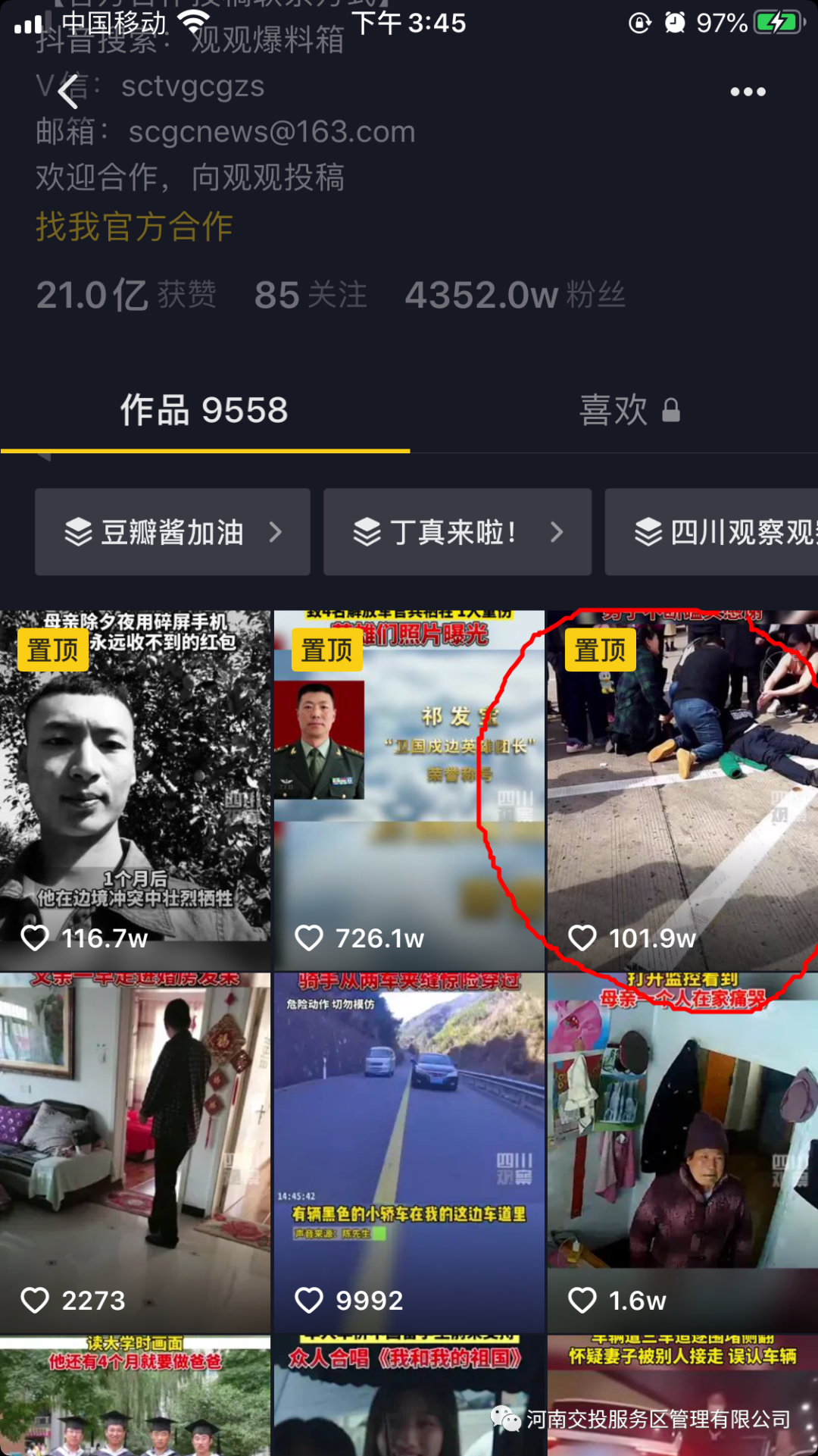 2021-02-20 作者:2月20日,河南廣播電視臺都市頻道記者就2月16日發(fā)生在禹州服務區(qū)救治心梗患者,家屬跪謝感恩事件進行現(xiàn)場采訪。該事件由圍觀群眾發(fā)表抖音短視頻后,2月19日經(jīng)四川廣播電視臺新媒體官方認證抖音號“四川觀察”轉(zhuǎn)發(fā),一天內(nèi)獲贊101.9萬,分享下載近2000次,并曾一度排名抖音熱榜…
